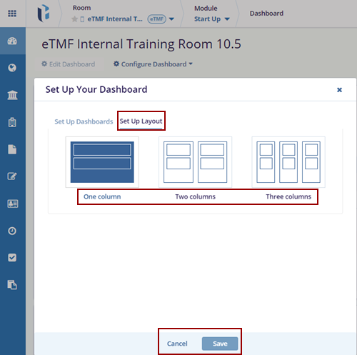 The Set-Up Layout allows users to customize the visual structure of the dashboard by choosing a column-based layout. This ensures that the dashboard is organized according to user preferences. The user has the option to select from – One, Two, or Three Columns.