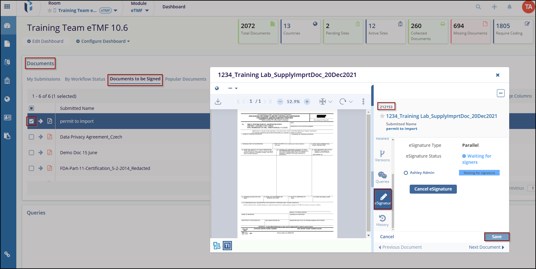 - Make any necessary comments and click the Save button for the appropriate action (Signing or Cancelling).