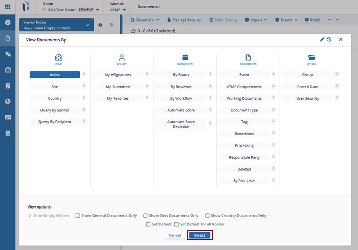 - Navigate to the eTMF module, there select Document section, at the top of the Index Pane, the user will see the View Document By dropdown menu.