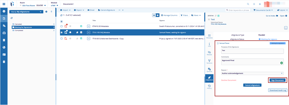 - Indicate your reason (either for signing or for rejecting the document) using the dropdown menu. The reasons are populated from the Settings area and are usually set up during room configuration. Please check the Document section from eTMF Module for additional information.