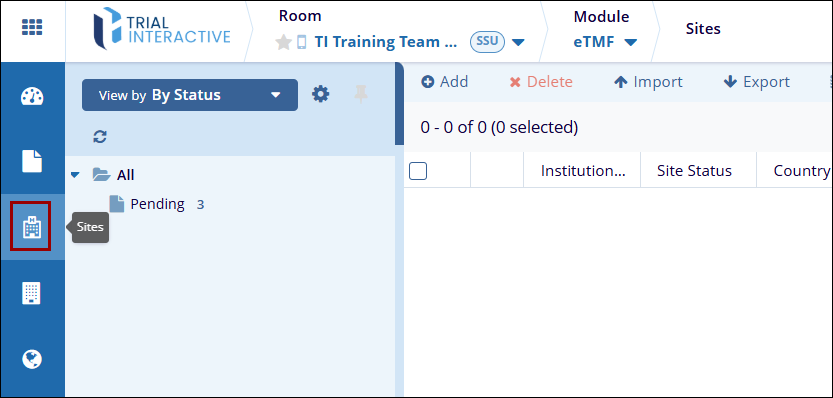 To access the Sites modal in eTMF, follow the steps below.
