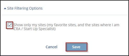 You can choose to view only those sites where you are assigned as a CRA or as a Study Startup Specialist in either the Sites sub-module or in the SSU application in Trial Interactive.