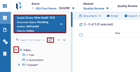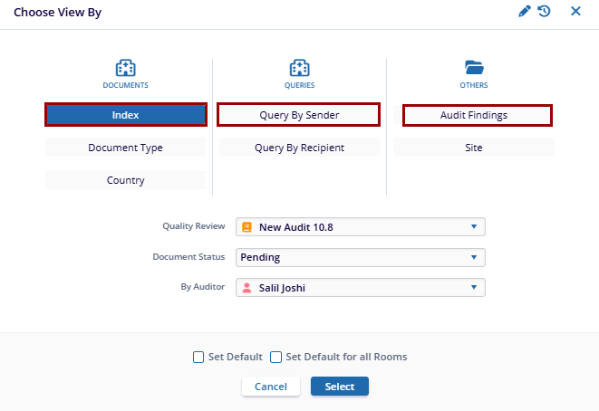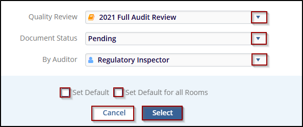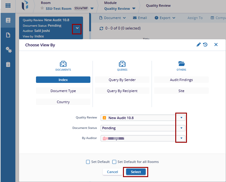 - Below the view by dropdown, the user can see the fields for Quality Review, Document Status, and By Auditor.