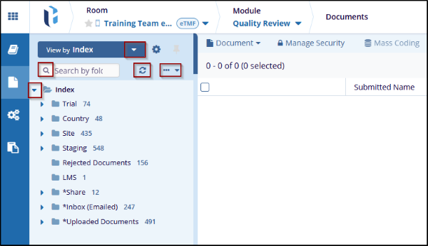- The user can expand folders such as Trial, Country, Site, Staging, Rejected Documents, LMS, Share, Inbox (Emailed), and Uploaded Documents to view available documents.