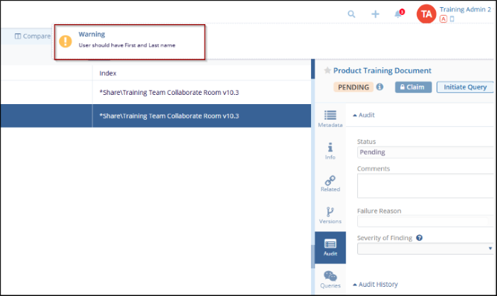To complete the request for eSignature, make sure the user has first and last name mentioned, while creating a user in the user management, else warning message is displayed.