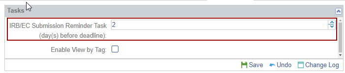 - Define the number of days from the IRB/EC submission reminder task option by clicking the up & down arrow.