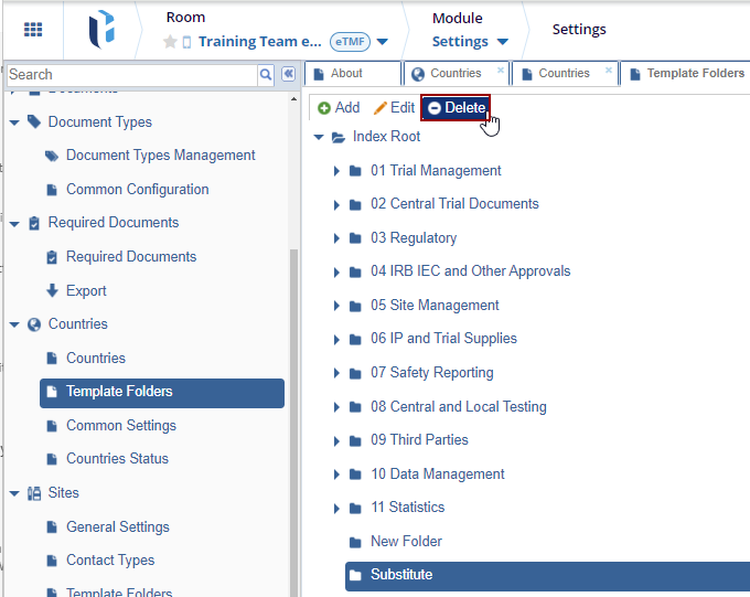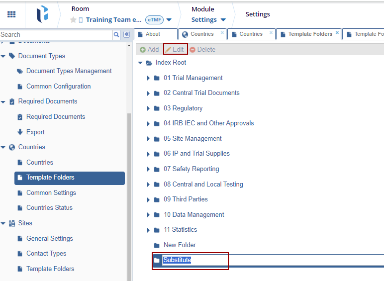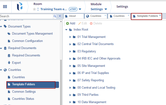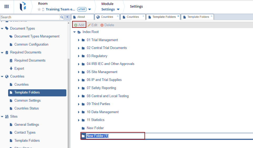 In this window, you can Add, Edit, or Delete template folders and subfolders in the root folder for managing country-specific documents.
