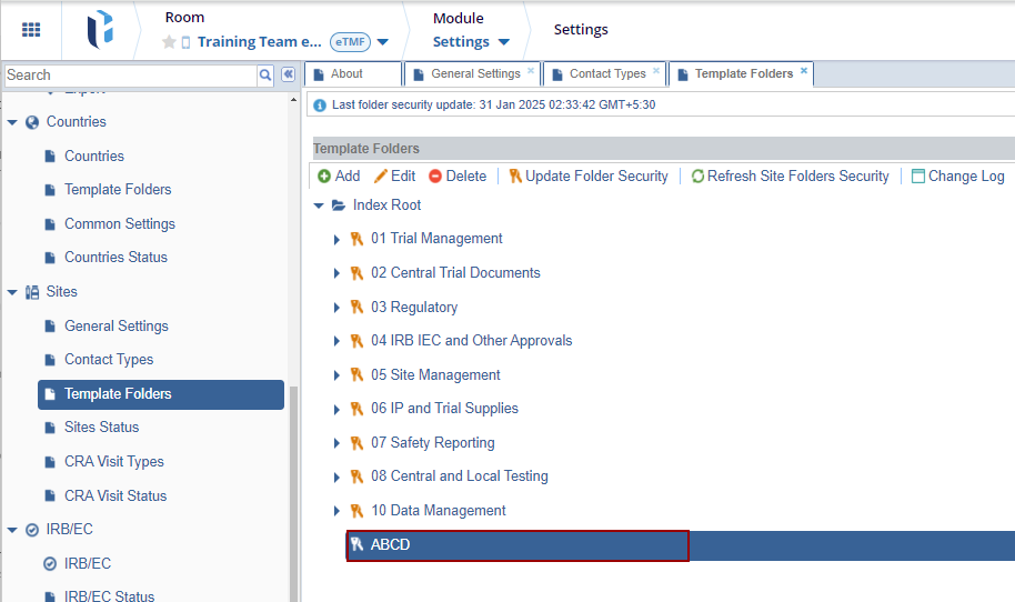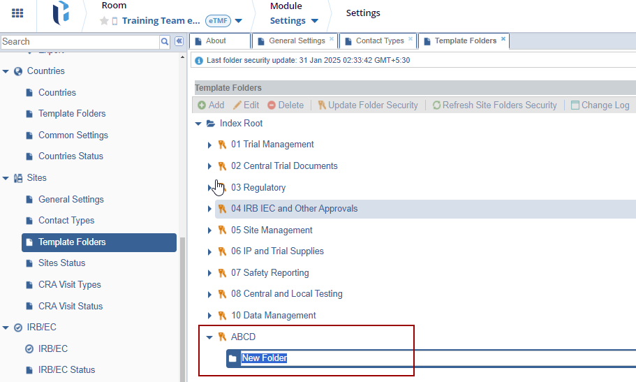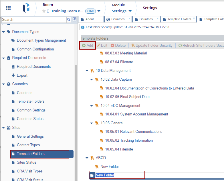 The Template Folders panel is a crucial tool for generating the folder structure where all Investigative Sites' documents will be stored during the study. The structure created here follows the guidelines provided in the Configuration Manual.