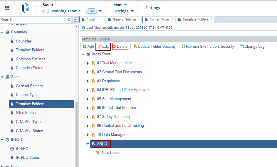 - In eISF rooms, this is also where site folder security rules are created and maintained. These security rules are laid out in the configuration manual and should be adhered to throughout the study. If changes need to be made, please work with the Trial Interactive Service Desk.
