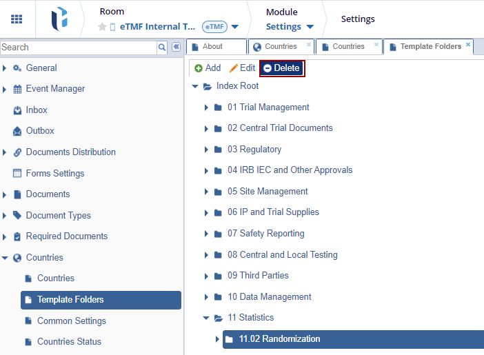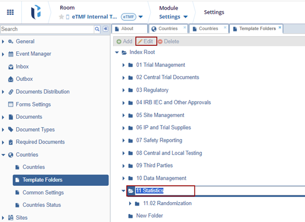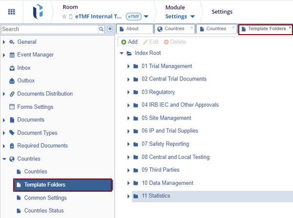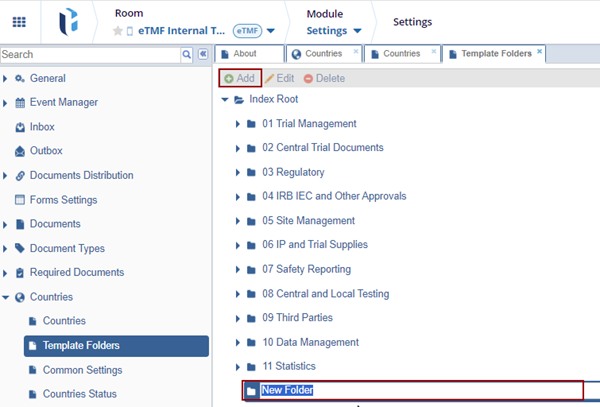 In this window, you can Add, Edit, or Delete template folders and subfolders in the root folder for managing country-specific documents.