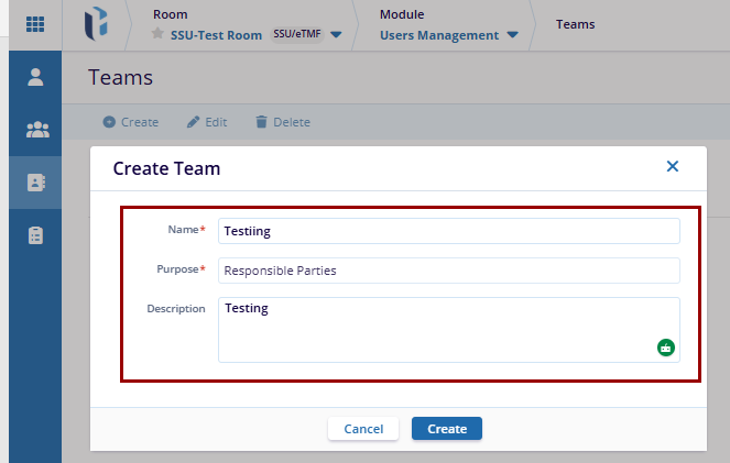 - In the Create Team window, enter the Team Name in the mandatory field. To add