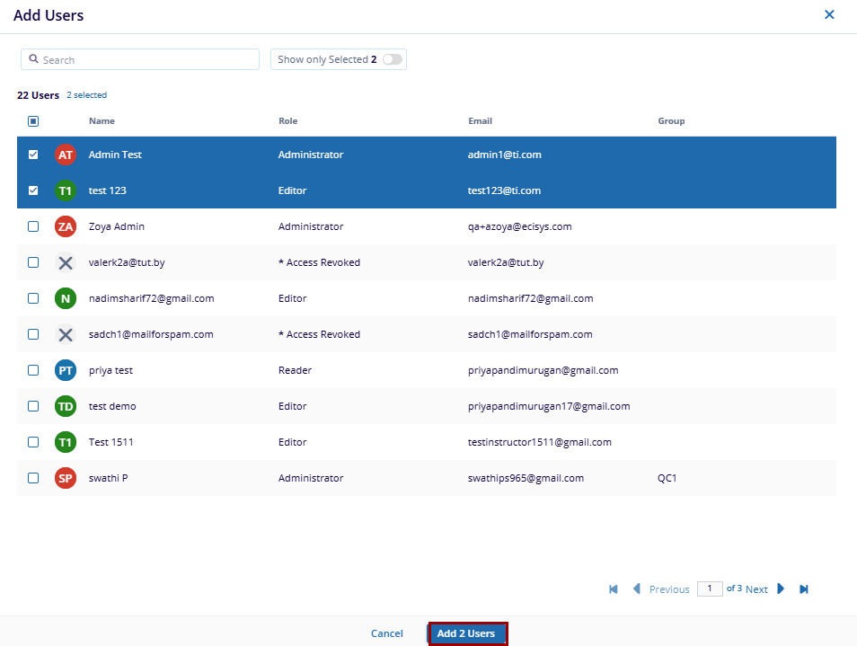 - The Memberl will display. Use the search bar to locate users and click the + icon next to