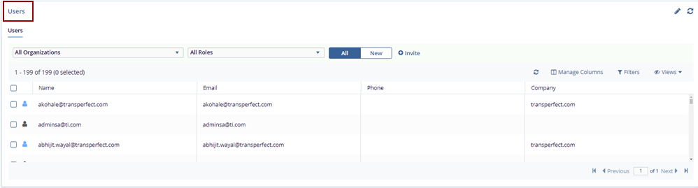 This tab displays available users and is added to the SSU module. Additional actions include Inviting a User, Editing the Dashlet Name, Refreshing, Managing Columns, Creating & Managing Filters, and Saving Views.
