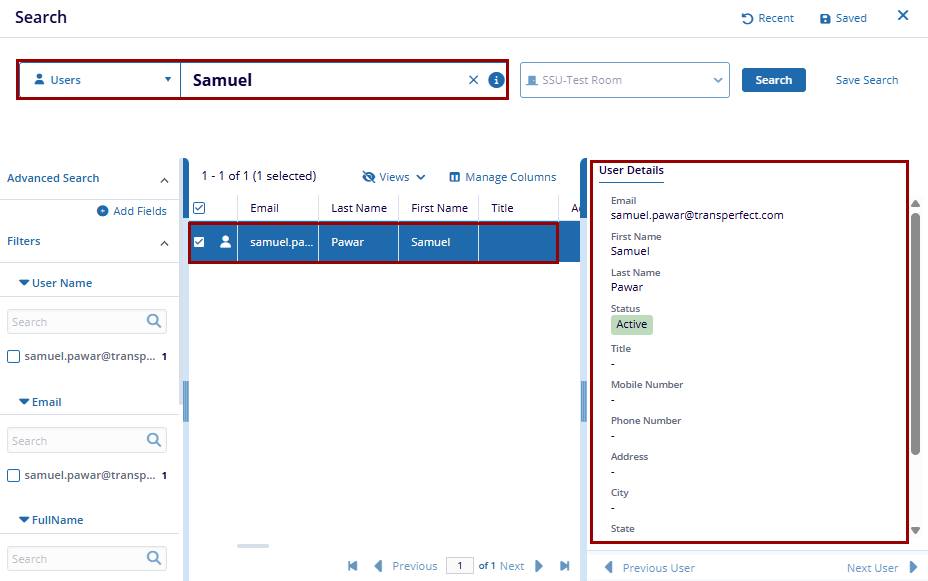 - After selecting, it opens the User details in the right pane, which includes user data such as Email, First Name, Last Name, Status, Title, and Mobile Number.