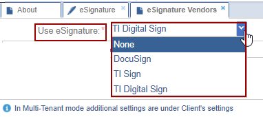 - Click the Use E-Signature dropdown to select the vendor. Refer to the screenshot below: