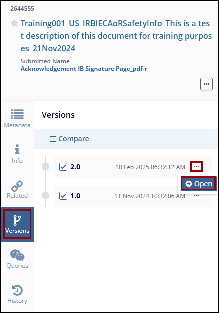 The Versions tab allows users to view and compare the different versions of a document. This is most commonly applicable in Trial Interactive rooms, such as TI Collaborate rooms, where documents are created, edited, and reviewed prior to becoming effective. However, this can also apply to a study room where expired or expiring documents have been replaced with newer copies.
