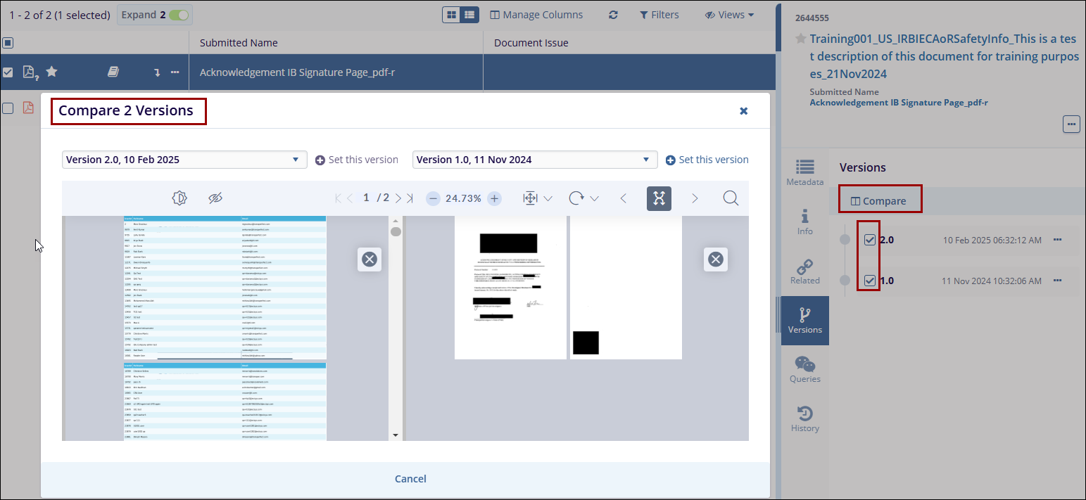 - Select the documents and click on the Compare button to display documents from both versions in a side-by-side view.