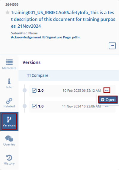 - Select a document from the grid and click the Versions tab from the Metadata panel.