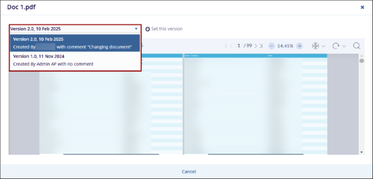 - Click on the dropdown menu to access the different document versions.