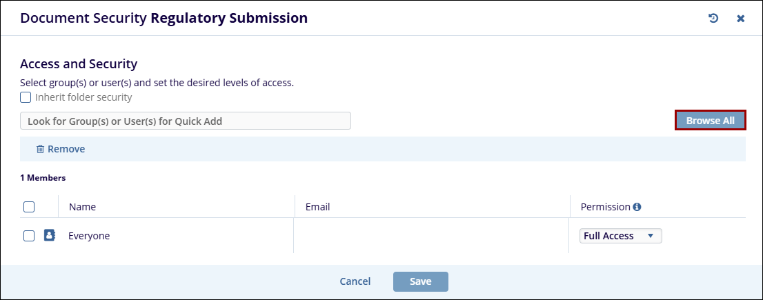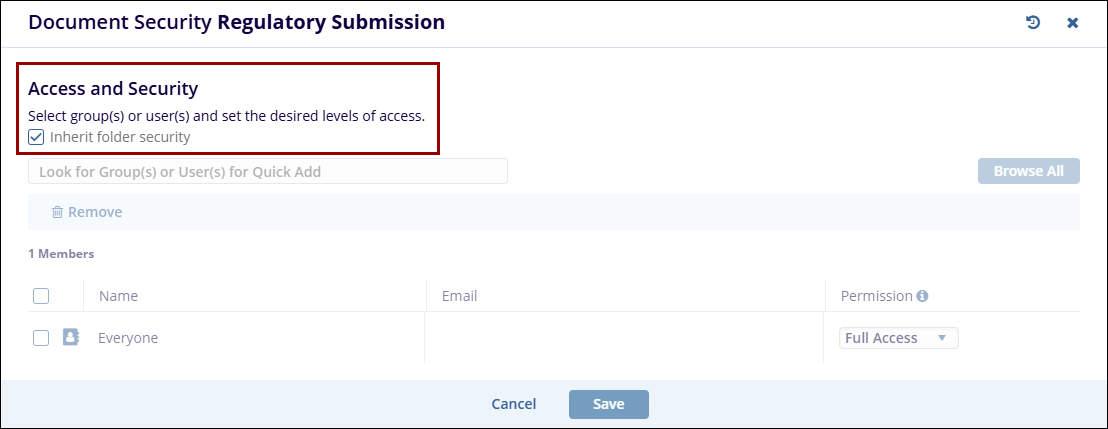 - The Documents Security window will display the users or groups