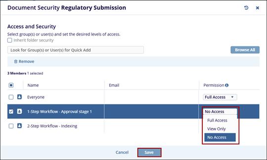 the appropriate access level, such as Full Access, View Only, or No Access and click