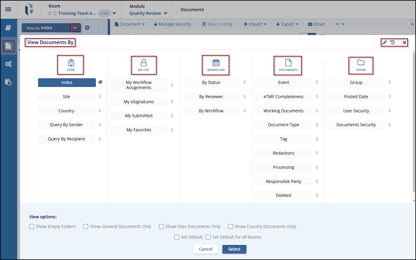 The View Document By allows users to filter documents based on requirements such as Index, Sender, Recipient, Status, Site, Document Type, etc. This improves document search for users to focus on relevant information. Navigate to View document by the dropdown menu at the top of the index pane. Use this menu to select the preferred view of the documents in the Grid view and Document view.