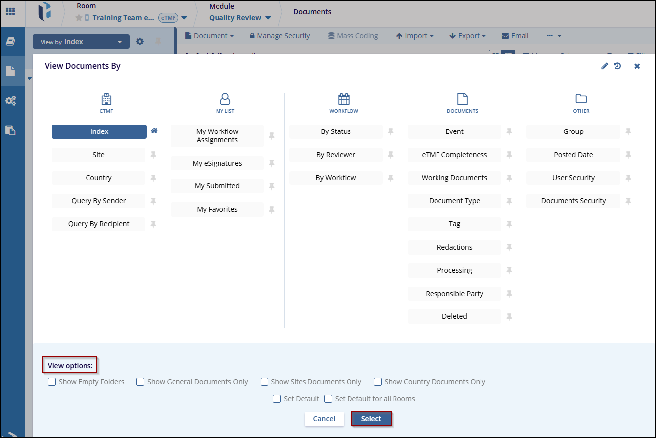 The View Options section allows users to control the type of documents displayed in the list by selecting or deselecting options.