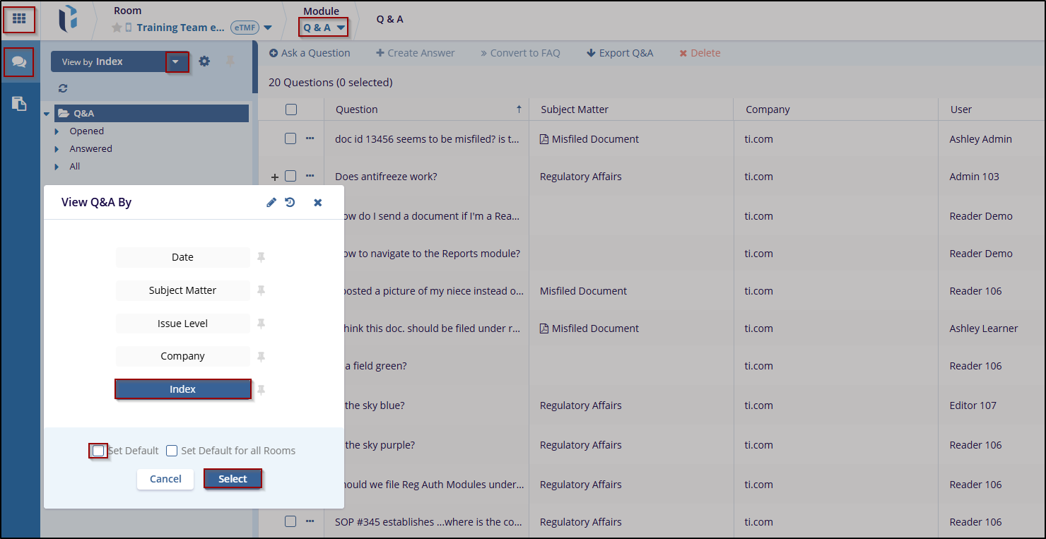 - After selecting the view Q&A by options, click the Select button to apply the changes, these changes will reflect at the top of the Index pane, or click the Cancel button to discard the changes.
