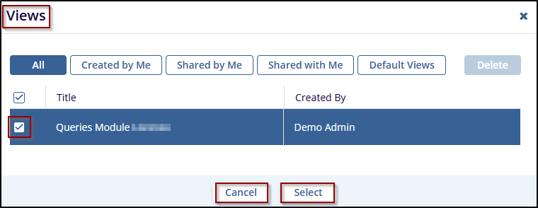 - Once finished managing views, click the Cancel button to discard any changes, or click Select to apply the changes to the selected view.